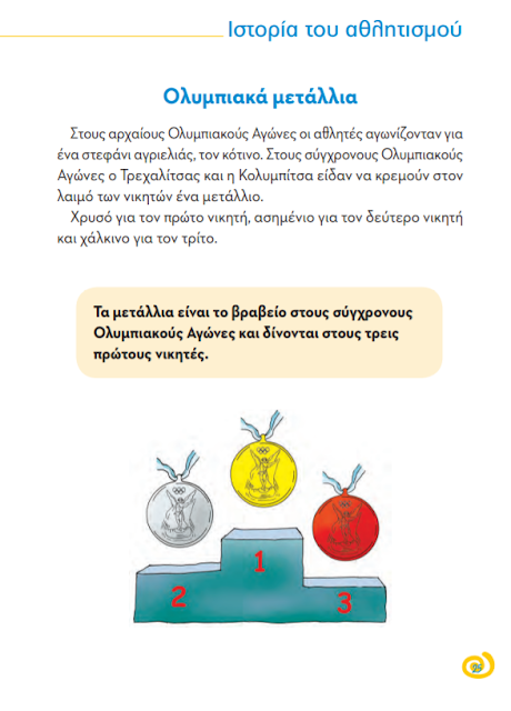 ΑΠΟΣΠΑΣΜΑ ΑΠΟ ΤΟ ΒΙΒΛΙΟ Φυσική Aγωγή A΄& B΄ Δημοτικού ΣΕΛ.16Ο Τρεχαλίτσας και η Κολυμπίτσα ονειρεύονταν την ημέρα που θα νικούσε ο αδερφός τους και θα τον στεφάνωναν οι υπεύθυνοι του αγώνα με τον κότινο. Ο κότινος ήταν το βραβείο της νίκης. Τον έφτιαχναν από τα κλαδιά της ιερής αγριελιάς η οποία βρισκόταν μπροστά στον ναό του Δία. Τους νικητές, λοιπόν, τους στεφάνωναν με τον κότινο. Όλοι τους τιμούσαν και τους σέβονταν. Όταν επέστρεφαν στην πόλη τους, γκρέμιζαν ένα μέρος των τειχών της για να περάσουν. Με αυτό τον τρόπο έδειχναν ότι με τέτοιους άντρες δε χρειάζεται η πόλη τους τα τείχη για προστασία από τους εχθρούς